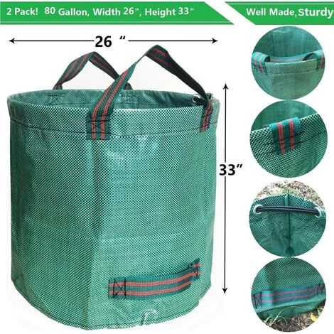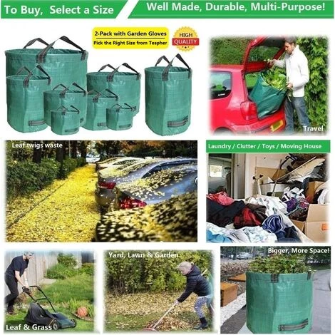【Lot de 2, 80 gallons, grande taille ! Diamètre 26 « , hauteur 33 », sacs de jardin avec gants de jardinage imperméables】 Fabriqués à partir de tissu en polypropylène tissé robuste et résistant aux déchirures. Sacs de bâche stables, bien faits et durables avec des gants de jardin. Parfait pour les sacs de feuilles, les sacs de déchets de jardin, les travaux de jardinage de pelouse. Mieux et plus grand que les autres sacs de jardinage. Chaque sac à feuilles a une capacité de 80 gallons, vous pouvez le remplir avec plus de choses. Idéal pour le garage, les sacs de rangement ménagers, les sacs de déchets de camping, les sacs de déménagement 【Sacs de bâche réutilisables et polyvalents ! Sacs de jardin pour pelouse bien conçus et durables avec 4 poignées en nylon renforcé】Avec son design spacieux et décent, son excellente qualité. Ces sacs de jardin sont parfaits pour les sacs de feuilles, les sacs de jardinage de pelouse, les sacs de déchets de jardin ; Garage, sac de rangement ménager, sacs poubelles de camping, sacs à linge. Sac de jardinage avec 4 poignées cousues 10 fois. Particulièrement durable et robuste ! Chaque sac à feuilles de jardin est emballé dans une boucle en plastique qui maintient ouverte la partie supérieure du sac à feuilles 【Très pratique ! Sacs de déchets de jardin stables ! Ils peuvent rester debout et ouverts lors du remplissage ! Sacs de jardinage particulièrement durables et robustes !】Tous les sacs de jardin avec un nouveau design d’emballage. Sac à déchets réutilisable et bien fait ! Il est fabriqué en tissu tissé PP 150 g/m² stabilisé aux UV, résistant à la déchirure et hydrofuge. Il rend les sacs de feuilles de jardin Tespher plus durables et robustes que les autres sacs de jardinage. Il est idéal pour les sacs à feuilles, les sacs à déchets de jardin, les sacs à déchets de jardin ; sac de rangement ménager, sac poubelle de camping!