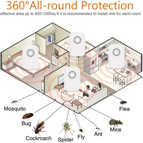 - 2020 Dernière technologie ultrasonique: – Avec une conception à double puce intelligente, le répulsif d’insectes à ultrasons stimule le nerf auditif avec des ultrasons dans la gamme de fréquences de 20 kHz à 65 kHz et détruit le système central olfactif et nerveux des ravageurs et des rongeurs. Ce type d’échographie peut rendre les rats, araignées, mouches, puces, fourmis et autres types de rongeurs et d’insectes très inconfortables, les chassant de nos maisons et de nos habitats.