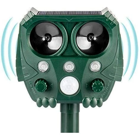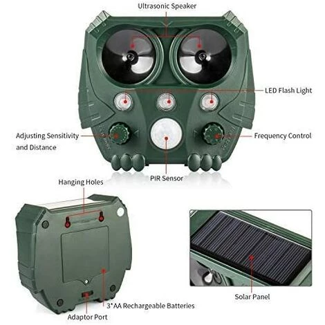– Un son ultrasonique puissant qui scares animales. L’onde sonore est activée lorsque l’animal est dans la gamme de détecteurs PIR – Branchez ces animaux et poussez les animaux de la zone dans la question.