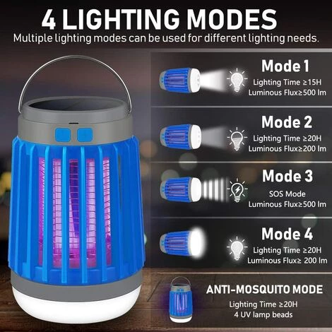 3 MODES D’ÉCLAIRAGE: Il y a 3 modes: Bug Zapper, LED Light, Solar Fly Killer Lamp à choisir. Et la lumière de camping a deux niveaux de luminosité: lumière forte, lumière faible, 60 heures seulement pour la fonctionnalité zapper.