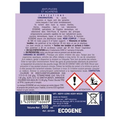 Anti-puces et acariens ECOGENE pour lutter efficacement contre les puces, poux et acariens qui se nichent dans les tapis, tissus, moquettes et literies.