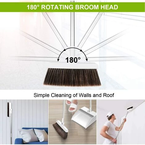 Tête de balai rotative à 180 °】 La tête de balai rotative à 180 ° pratique est un balai parfait sans se desserrer ni se casser. Vous pouvez l’utiliser pour nettoyer tous les coins de votre maison. Non seulement vous pouvez nettoyer le sol, mais vous pouvez également nettoyer les murs.[Poils de vadrouille à 3 couches] Les poils de vadrouille denses offrent un meilleur effet de nettoyage, sont très doux, n’endommageront pas votre sol, offrent une plus grande surface de nettoyage, ne laissent pas de poussière et assurent un nettoyage efficace.[Ensemble de balai de rangement vertical compact] Le balai peut être placé dans une pelle à poussière et rangé à la verticale sans prendre de place. Il est plus pratique à utiliser.
