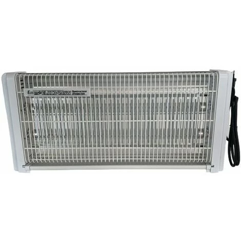 La lumière émise par les 2 tubes fluorescents attire les insectes vers la grille métallique haute tension (1800 V sous quelques mA) pour les foudroyer.