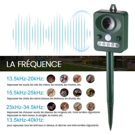 13,5 kHz-40 kHz : pour repousser tous les animaux ci-dessus et allumer une lumière clignotante puissante