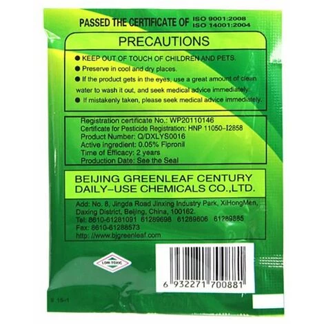 Mode d’emploi : Divisez un sachet de poudre en 3 ou 4 parties et placez-les à l’endroit où se trouvent les cafards. Tous les cafards seront infectés et tués dans les trois jours après avoir mangé, et l’effet significatif durera trois mois.