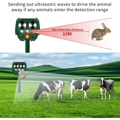 【Fréquence réglable】: Euipped avec de puissants feux clignotants à LED et un dispositif de détection. Avec une lumière de détection intégrée, il peut détecter les mouvements des animaux et la chaleur corporelle avec un angle de 120 degrés et une distance de 10 mètres. De plus, la fréquence peut être ajustée pour émettre un mélange d’ultrasons de diverses ondes, de fortes lumières clignotantes et une alarme sonore pour effrayer les animaux