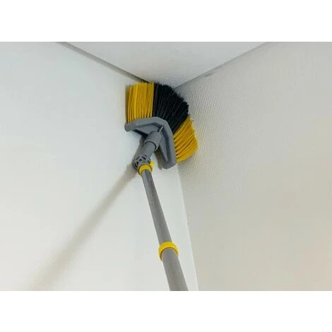Balai d’angle multipositions sur manche télescopique de 1,1 m à 2,3 m | Inclinaison rotation | Nettoyage poussière moutons toiles d’araignées | Reliefs plafond angles tuyaux | Kibros 101651