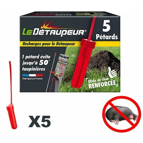Petard detaupeur X5, la solution redoutable garantissant une efficacité optimale de par une onde de choc renforcée afin d’éliminer les taupes de votre jardin. Permet d’éviter jusqu’à 50 taupinières.