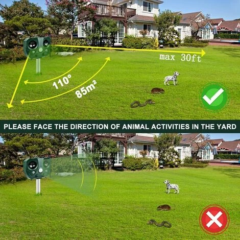 - ?Répulsif contre les ultrasons ? : ce répulsif pour chat fonctionne avec des ultrasons et des lumières LED pour chasser les chiens, chats, martres, ratons laveurs, souris, oiseaux, renards, rongeurs, martres, gibiers, etc. L’appareil fonctionne sans produits chimiques et est inoffensif pour les humains et les animaux.