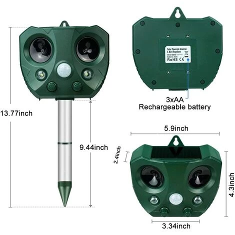 - 2 modes de charge et 5 modes réglables : 3 piles AA intégrées, chargées par l’énergie solaire pendant la journée. Ou branché à votre chargeur USB via un câble micro USB (inclus). La fréquence irrégulière et variable le rend plus efficace pour éloigner les animaux les plus agressifs qui peuvent s’adapter à une bande de fréquence spécifique et devenir immunitaire.