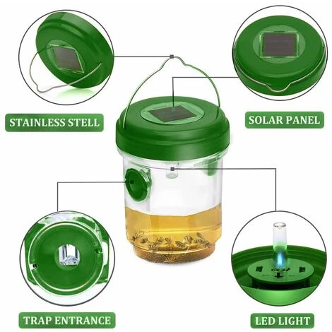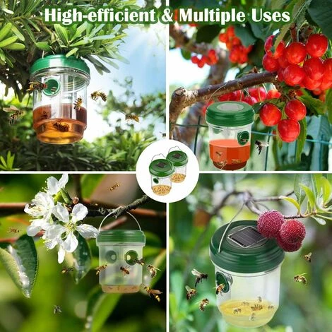 Ajoutez simplement de l’eau sucree, du miel, du jus ou de la biere comme appats, allumez l’interrupteur, puis accrochez-le a l’arbre ou placez-le sur une surface plane.