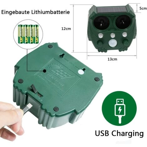 - 【Double charge USB et solaire】 Le répulsif à ultrasons pour animaux effraye les chats avec 4 piles AA intégrées, chargées par l’énergie solaire pendant la journée. L’appareil est chargé par un panneau solaire en polysilicium pour stocker de l’énergie pour un fonctionnement dans l’obscurité, comme la nuit. S’il n’y a pas assez de lumière, vous pouvez charger l’appareil à l’intérieur avec un câble USB.