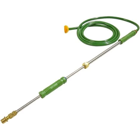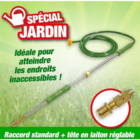 Elle est Ă©quipĂ©e d’un mĂ©canisme de pompe Ă main vous permettant d’envoyer votre jet d’eau Ă de grandes hauteurs. Ne prenez plus le risque de monter sur votre toit pour le dĂ©mousser. Traitez vos arbres mĂŞme les plus hauts tout en restant au sol. La lance de pulvĂ©risation Ă jet continu est aussi idĂ©ale pour votre toiture. Informations techniques, Dimensions : longueur de lance de pulvĂ©risation : 86 cm, longueur du tuyau : 210 cm. Accessoires : poignĂ©e ergonomique, tĂŞte en laiton rĂ©glable.