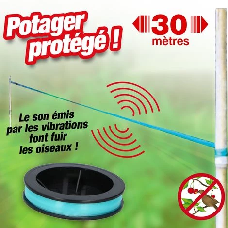 Ruban dissuasif oiseaux longueur 30m, largeur 6mm. Positionnez ce ruban au-dessus des semis, des gazons fraîchement semés ou au-dessus de l’étang et dissuadez de cette façon les oiseaux de s’approcher. Dès qu’il est resserré et que le vent se lève, ce ruban fait un désagréable bruit vibrant qui apeure les oiseaux. C’est également un produit optimal pour protéger les arbres fruitiers.