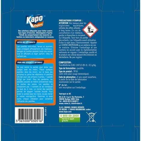 Les Pastilles anti-mites, larves et acariens protègent efficacement vos manteaux, lainages, et textiles pendant toute une saison tout en diffusant un parfum léger. Ces pastilles insecticides de dernière génération sont disposer aux endroits à protéger (tiroirs, coffres, armoires…). Elles ne tachent pas.Avant toute utilisation, assurez-vous que celle-ci est indispensable, notamment dans les lieux fréquentés par le grand public. Privilégiez chaque fois que possible les méthodes alternatives et les produits présentant le risque le plus faible pour la santé humaine et animale et pour l’environnement.