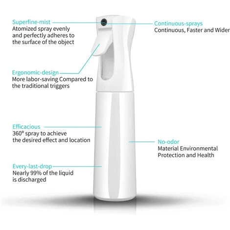 •Ce flacon pulvérisateur blanc a un volume de 300 ml, a une bonne étanchéité et la brume est fine et douce.