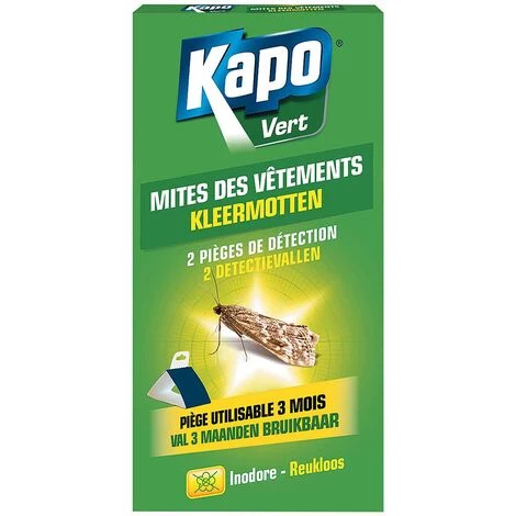 Comment utiliser les Pièges de détection des mites Kapo Vert ?Ouvrir le sachet avec des ciseauxPour ouvrir le piège : tirer sur la languette pour décoller la partie supérieure. Puis enlever le ruban adhésif rouge au dos du piège et placer le piège à l’endroit voulu. Presser sur la zone adhésive avec les doigts pour une bonne fixation.Pour retirer la protection de la surface encollée, presser avec un doigt, le piège contre la paroi et soulever de l’autre main le papier d’un geste rapide.Joindre les deux bouts et placer la languette dans la fente prévue à cet effet.Contrôler le piège au moins 1 fois par semaine. Le remplacer après environ 3 mois. 1 piège par armoire suffit. Il est préférable d’en disposer 2 dans les locaux plus grands.