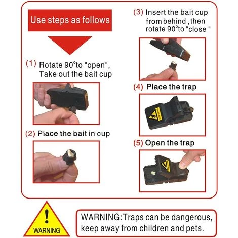 Facile à utiliser : retirez d’abord le récipient à appâts du fond et placez le fromage à appât, la saucisse de foie, le bacon, la crème de nougat et le beurre de cacahuète sur le récipient à appâts. Enfin, appuyez sur pour réinitialiser le conteneur et maintenez la souricière. Étant donné que le piège ferme rapidement le conteneur d’appâts une fois que la souris a relâché le piège, le piège à souris attrape rapidement les souris.