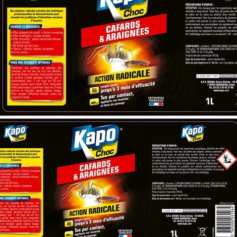 Le Kapo choc cafards et araignées est une formule à double action : curatif, il a un effet foudroyant et immédiat. Il élimine les cafards, blattes, araignées, fourmis, puces,… . Et préventif, il a une action insecticide efficace et durable jusqu’à 3 mois. Il ne laisse pas de trace.