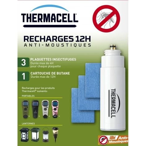 Cette recharge repulsif moustique contient 1 cartouche de butane avec 12 heures d’autonomie et 3 plaquettes de produit actif avec 4 heures de protection chacune.