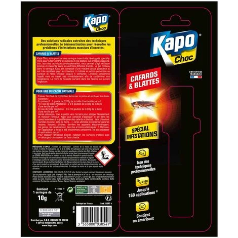Kapo Choc vous propose une seringue insecticide développée spécialement pour lutter contre les cafards et les blattes. Ce procédé d’application, issu des techniques professionnelles, vous permet d’agir de façon précise et mesurée dans les endroits difficiles d’accès.Le gel contenu dans la seringue Kapo est composé d’une matière active puissante et est très appétent pour les insectes. Il s’utilise en action préventive ou curative et reste efficace jusqu’à 4 semaines. L’insecte consomme l’appât mais ne meurt pas immédiatement afin de contaminer ces congénères. La mort survient dans les heures qui suivent l’ingestion.