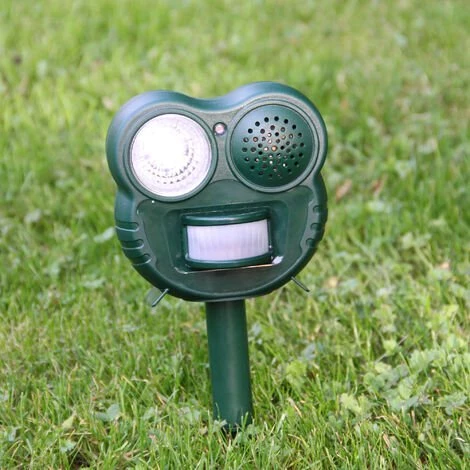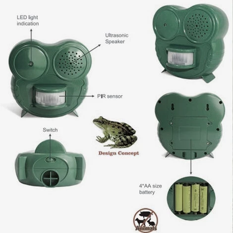 Repousse nuisibles audesign grenouille avec détecteur de présence. Ilémet des ultrassons pour repousser chauve-souris, pigeons,lapins, chats errants, rongeurs et déclenche unflash avec ses LED durant la nuit