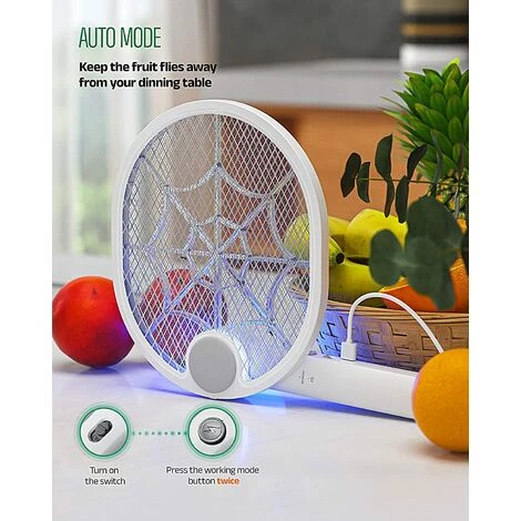 Deux modes de fonctionnement : vous pouvez vous débarrasser de ces mouches gênantes en frappant comme si vous jouiez au tennis en mode un. En mode deux, ce tue-mouches électrique peut protéger les fruits, le pain, les sandwichs et autres aliments sans bouger la main. Appuyez sur le bouton de mode de travail pour changer de mode. Appuyez une fois pour le mode 1 et deux fois pour le mode 2.